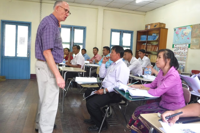 Some BYU professors from the linguistics departments of BYU Hawaii, BYU Provo, and BYU Idaho came to do some workshops with the Lao English professors from all around Vientiane. We went to help out. I didn't take a lot of pictures, but I should have! This is Dr. Anderson from BYU Hawaii talking about reading with the students. Fantastic training! It was such a pleasure to meet these very smart people!"